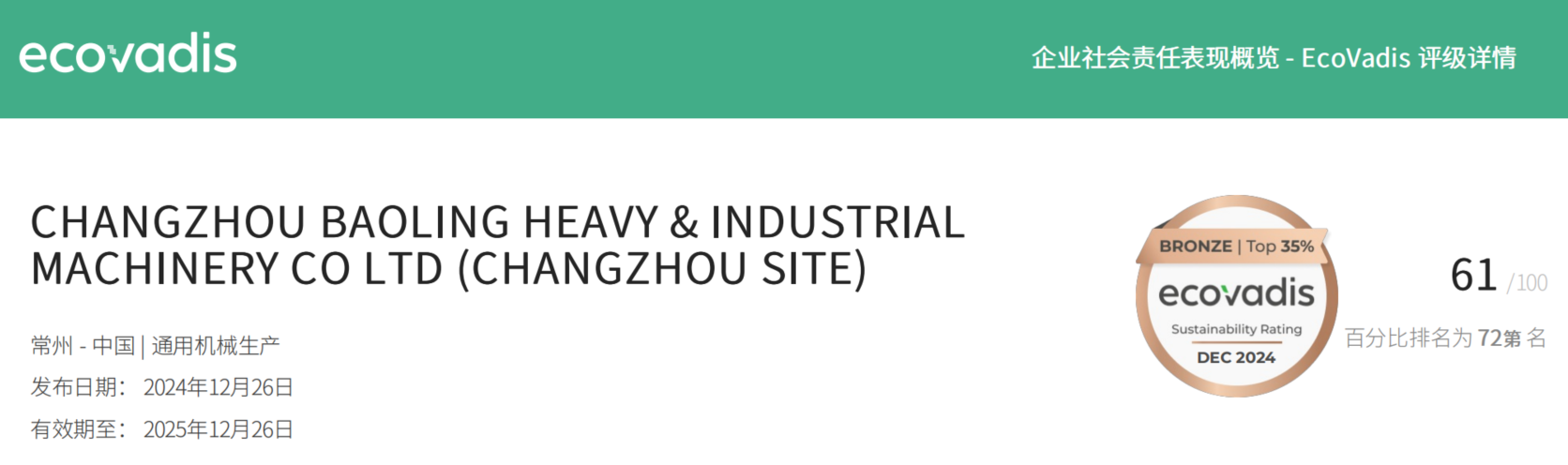 2024年12月26日,寶菱重工在EcoVadis企業社會責任評估中得分61分,并榮獲“銅牌”,在EcoVadis所有在評公司中躋身于前 35%(已超過 65% 以上的公司)。當前,“環境、社會責任和公司治理”(簡稱:ESG)水平已成為衡量企業長期價值和可持續發展能力的關鍵因素,其核心在于“友好環境、尊重員工、合規經營、可持續發展”。公司將可持續發展理念融入企業戰略與日程經營活動中,推動導入ESG